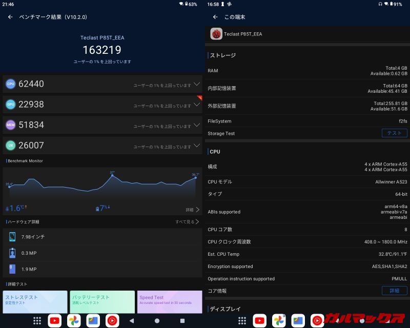 というのも昔買ったエントリーモデルHEADWOLF WPad 1ってやつはHelio P22Tでこいつよりも性能が低いんですが、そのレベルだとYouTube再生すらも安定しなかったので‥
