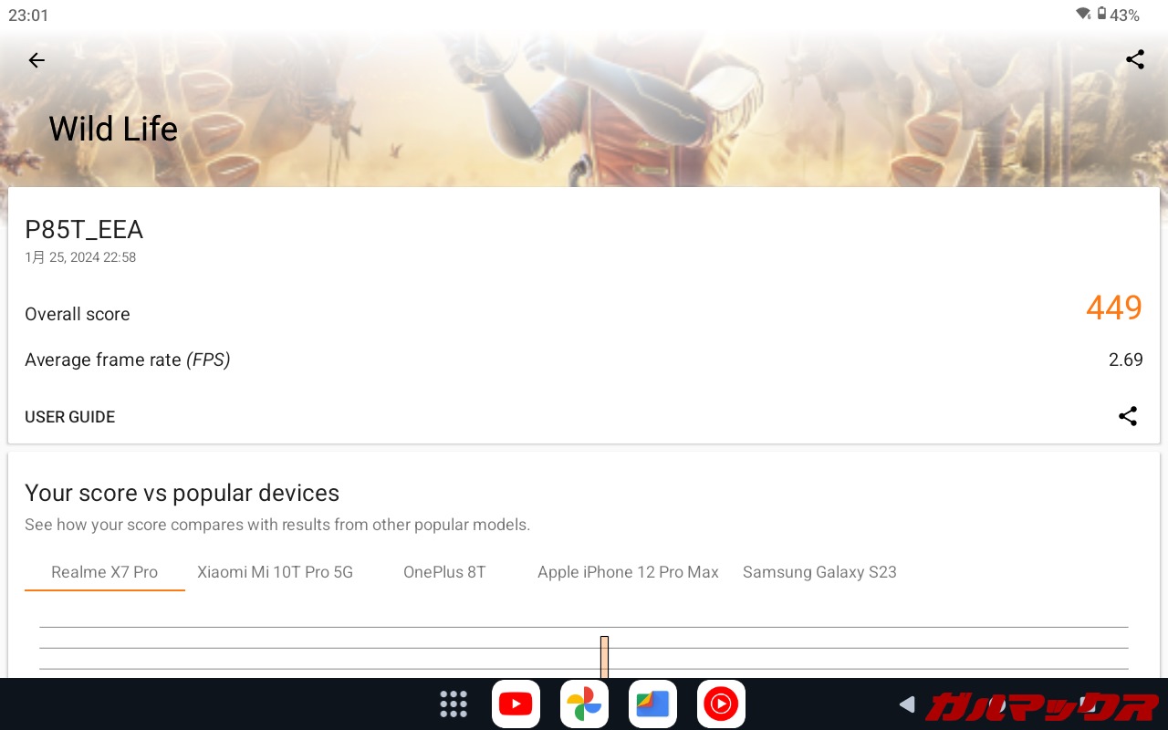 まぁわかってはいたんだけど、動作のモッタリ感はマジでいつもある。なんだったら動画を再生してるときや2D系ゲームしてるときはホームに戻るときとか、なんなら電源キー押してスリープするときさえも0.5~1秒のラグを感じちまいます。