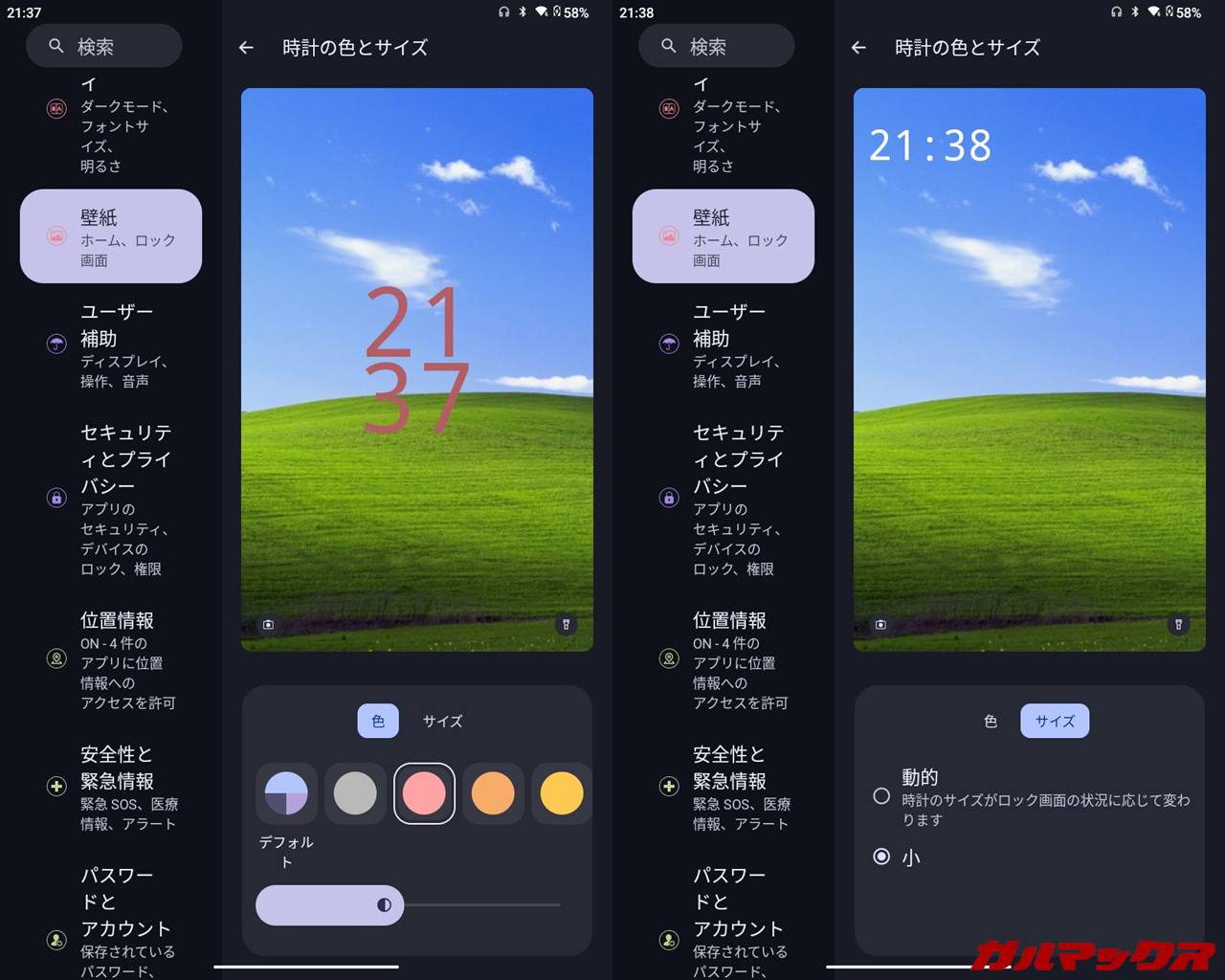 ▼Android 14の新機能であるロック画面カスタマイズも対応。デカい時計表示も小さめに表示させることができるようになったり、色の変更もできるようになりました(壁紙は自分で変えたヤツ)。↓
