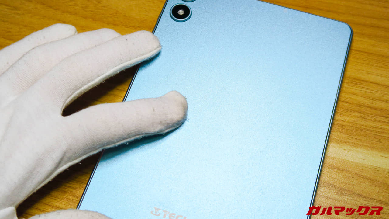 ▼触ってみたら背面パネルはサラサラでやや粗めなマット加工。指紋は完全に目立たん。さわり心地もいい感じでした。↓