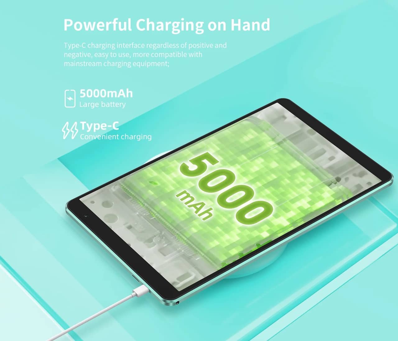 ▼バッテリー容量は5,000mAh、急速充電については記載なし。SIMやGPSは非対応ゆえ基本家で使うことになるので充電しながら使うのがいいかもしれません。↓