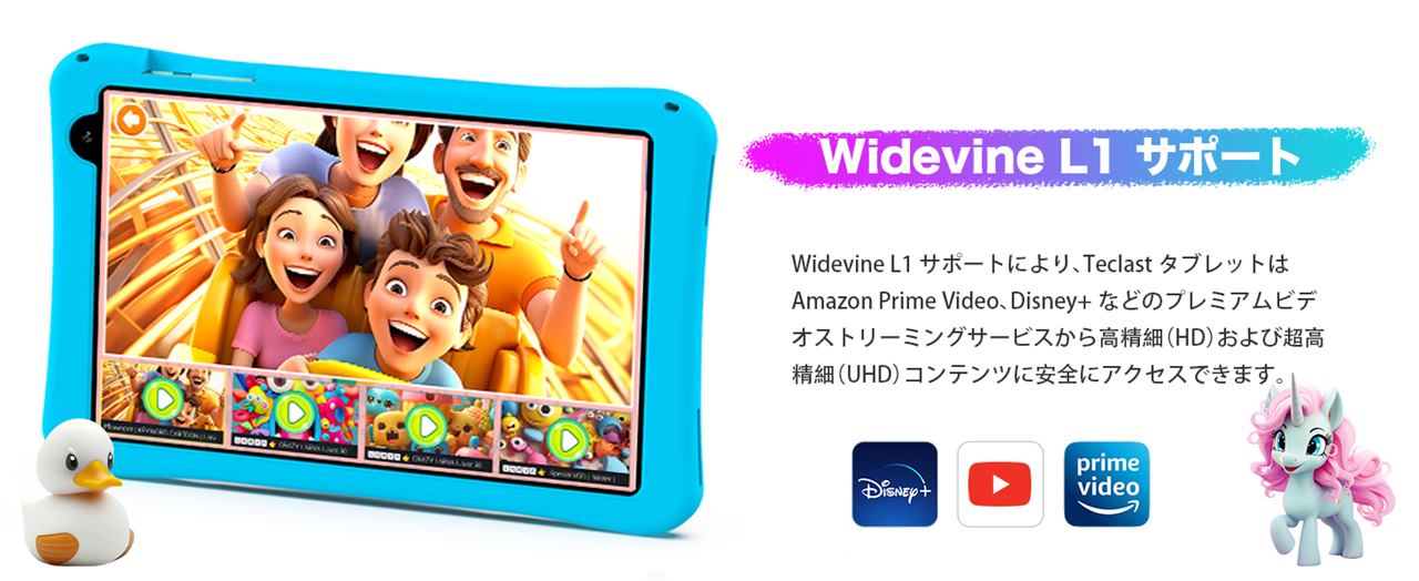 ▼プライムビデオ、ディズニーといったコンテンツをHD画質で視聴できるWidevine L1対応というのもポイントでしょう。YouTubeだけでなくディズニーとかの映画を見せて楽しませるにも使っていけるでしょう。↓