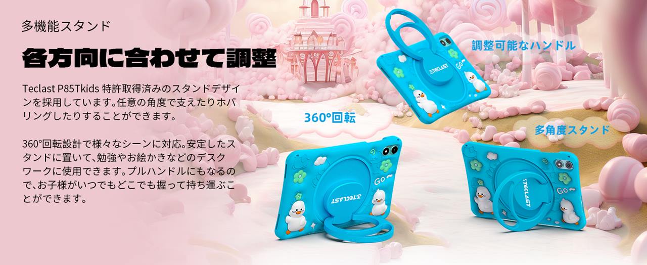 ▼デザイン自体はキッズ向けの水色ケースが装着されています。衝撃を吸収したり、背面に取り付けられているキックスタンドで自立させたり持ち運びに用いたりが可能となっているのが特色。うーんデザインがカワイイ!↓