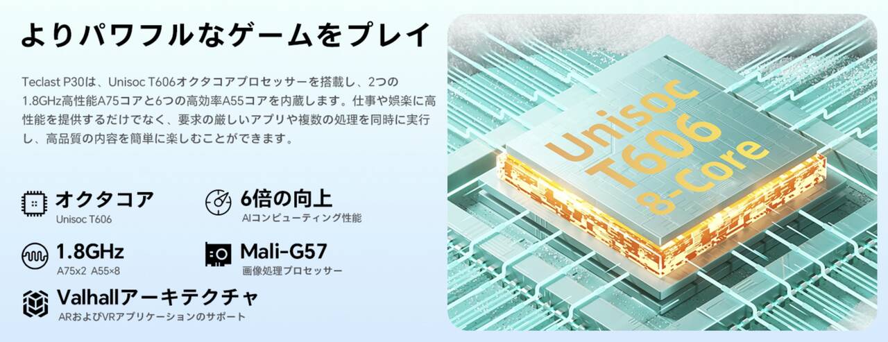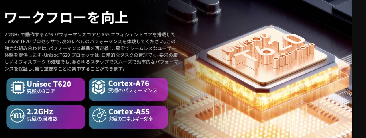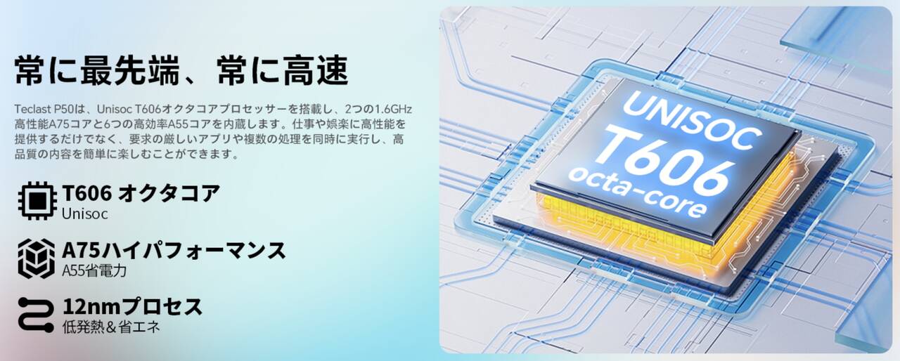 ▼SoCもTeclast P50と同じエントリーのUnisoc T606を搭載!本機もWEBサイト閲覧、動画視聴、SNSなどのライトユース向きとなってます。↓