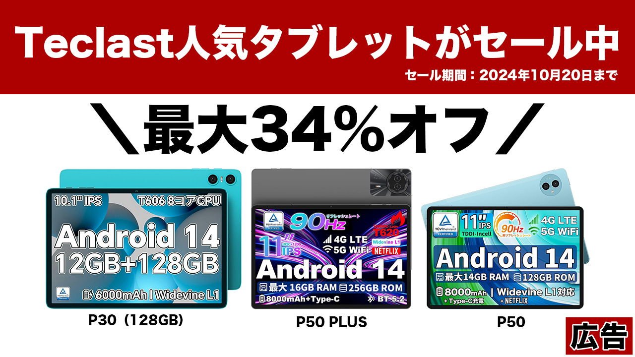お手頃価格のタブレットを数多くリリースしているTeclastが、Amazonで人気タブレット「Teclast T50 PLUS」「Teclast P50」「Teclast P30(128GB)」の3機種をセール価格で販売中!セールは本日10月20日まで!