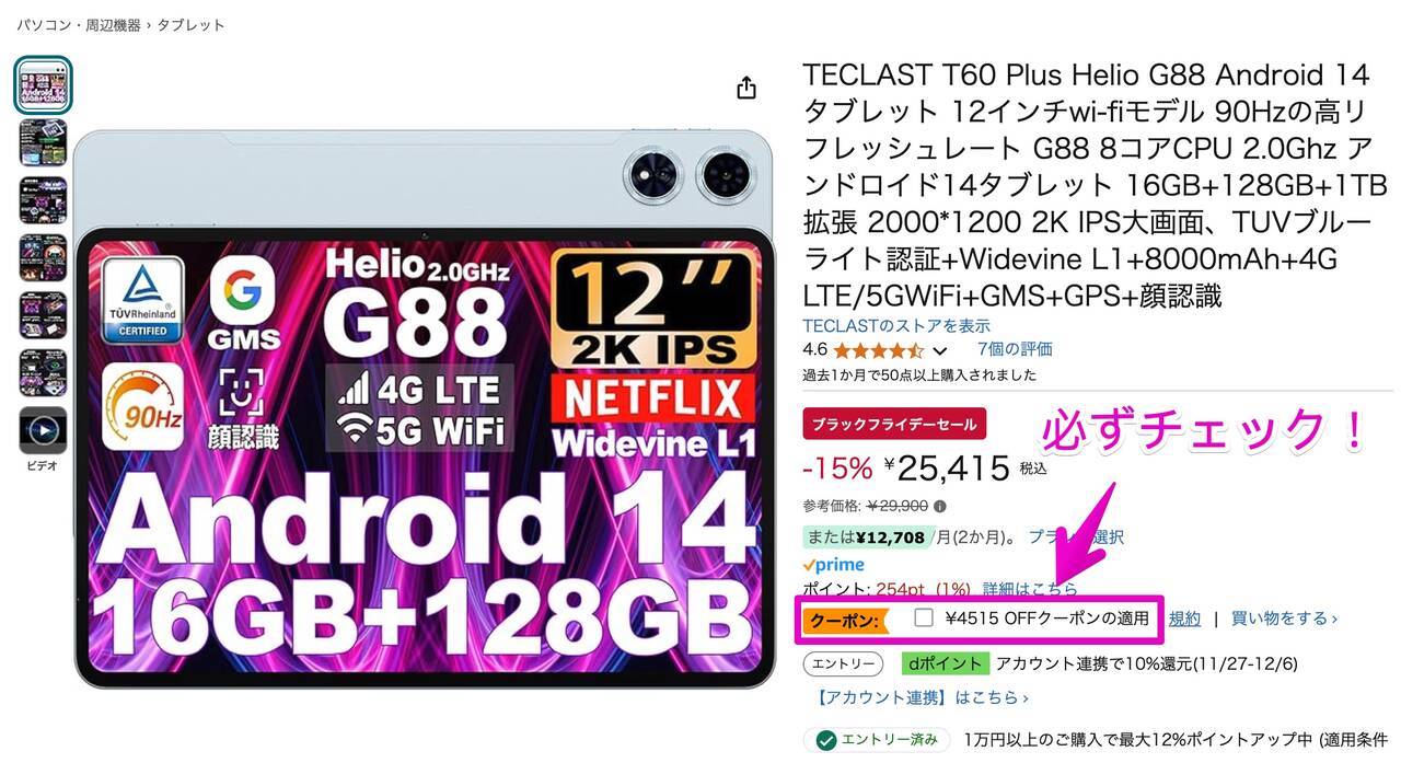 Teclast T60 Plusは発売したばかりの最新モデル。通常価格は29,900円ですがAmazonブラックフライデーで25,415円。さらにAmazonの4,515円オフクーポン適用で20,900円とかなりお安くなってます。
