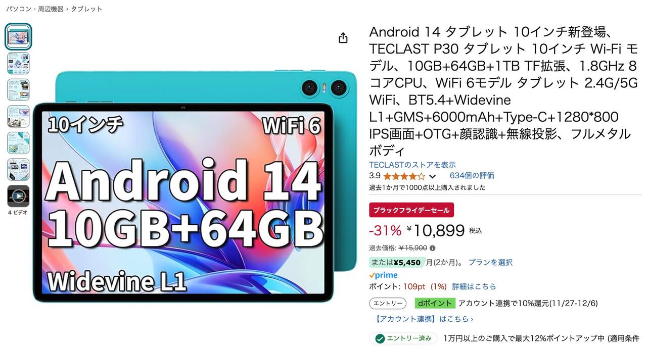 Teclast P30の通常価格は14,900円ですがAmazonブラックフライデーでは10,899円に割引されています!