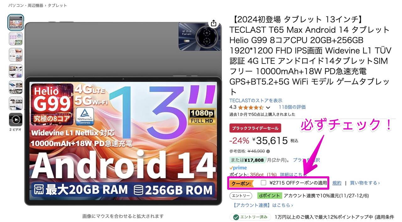 Teclast T65 Maxは通常価格42,900円のお品ですがAmazonブラックフライデーで35,615円に。さらにAmazonの2,715円オフクーポン適用で32,900円!