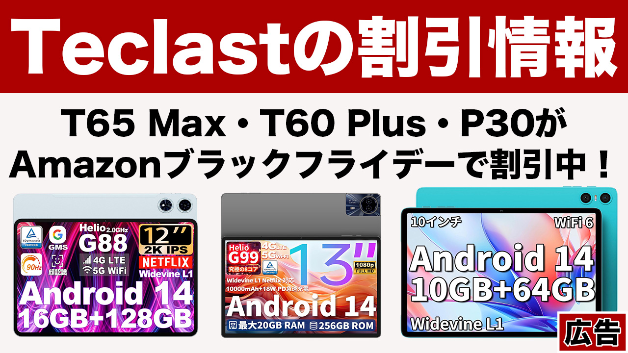 TeclastもAmazonブラックフライデー2024に参戦中!今回は「Teclast T65 Max」「Teclast T60 Plus」「Teclast P30」がお値打ち価格になっているので、ぜひチェックしてみて下さい!