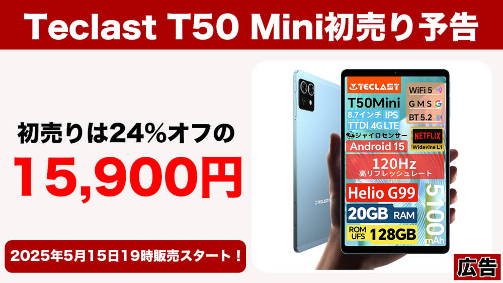 Teclastが8.7型のタブレット「Teclast T50 Mini」を2025年5月15日19時から日本で発売!初売りイベントでは24%オフの15,900円になるらしい。