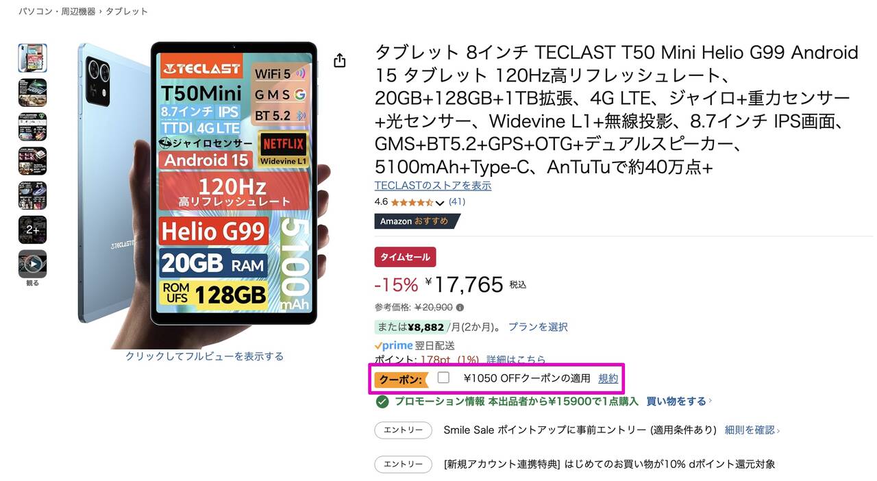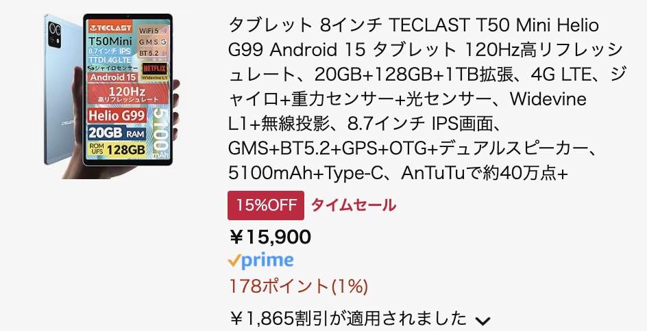 TECLAST T50 Miniは通常Amazonにて20,900円で売られてるモデルなんですが、今回のセールで5,000円オフ。1.6万円弱まで値下げされとります。