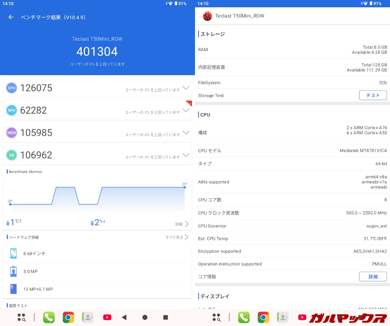▼AnTuTu参考値は39万点(本機は実測40万点)ほどあり、普段使いなら十分な動作なのでサブ用途主体のタブレットでは個人的に満足に値するチョイスに感じます。筆者も実際使ってたし。↓