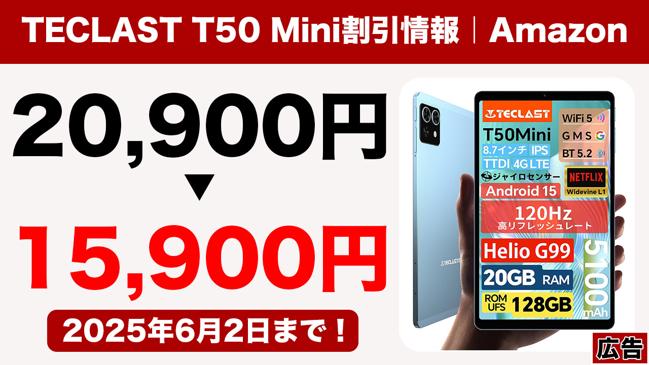 小型タブレットが欲しい方は今が大チャンス。TECLAST T50 MiniがAmazonのセールにて5,000円値引きの15,900円で販売されていますよ!SIM対応、性能良し、サイズ感良しでこの価格は個人的にかなりオススメ。セールは6月2日までなのでお早めに。