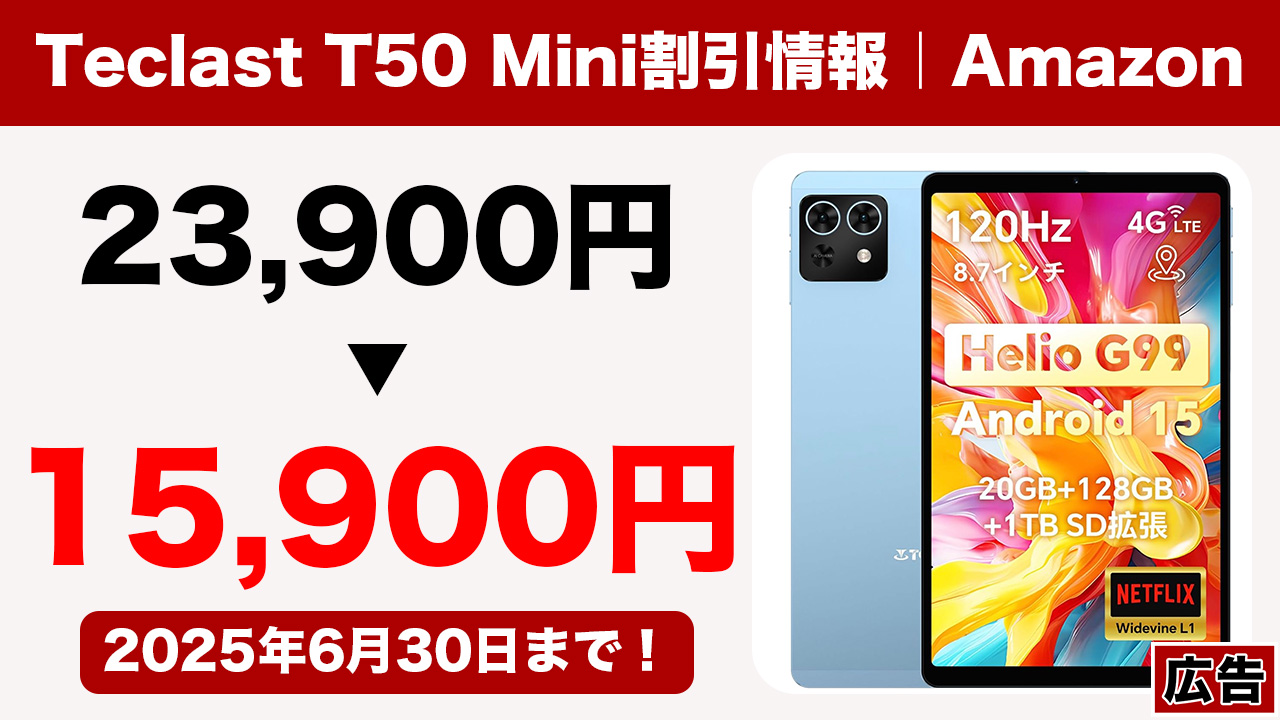 Teclast製の8.7インチの小型タブレットの1つであるT50 Miniがセールされていますよ!Amazonセールなので届くのが速いのもGoodだったり。セール期間は6月30日までとなっています。