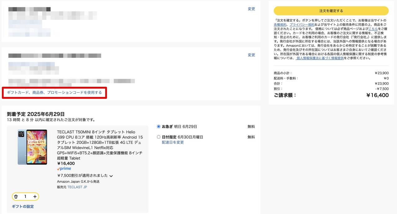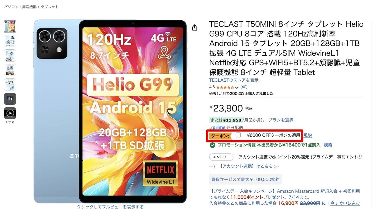 ▼Teclast T50 Miniの販売ページに行って6,000円オフクーポンにチェックを入れてカートに入れる。↓