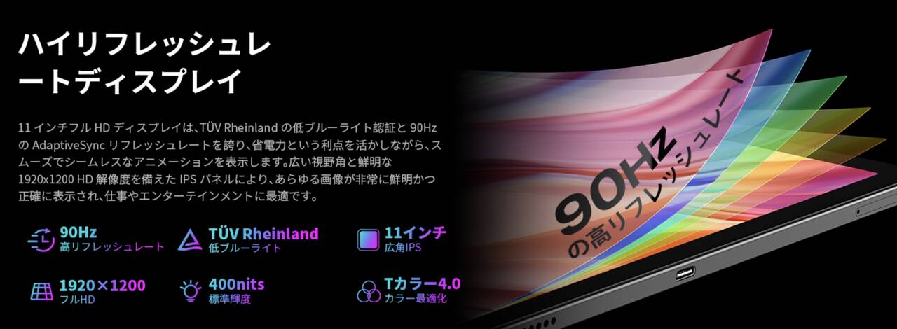 ▼ディスプレイは11型で解像度は1,920×1,200。90Hzの高リフレッシュレートにも対応。画面大きいと残像を感じやすくなるので有り難い仕様。↓