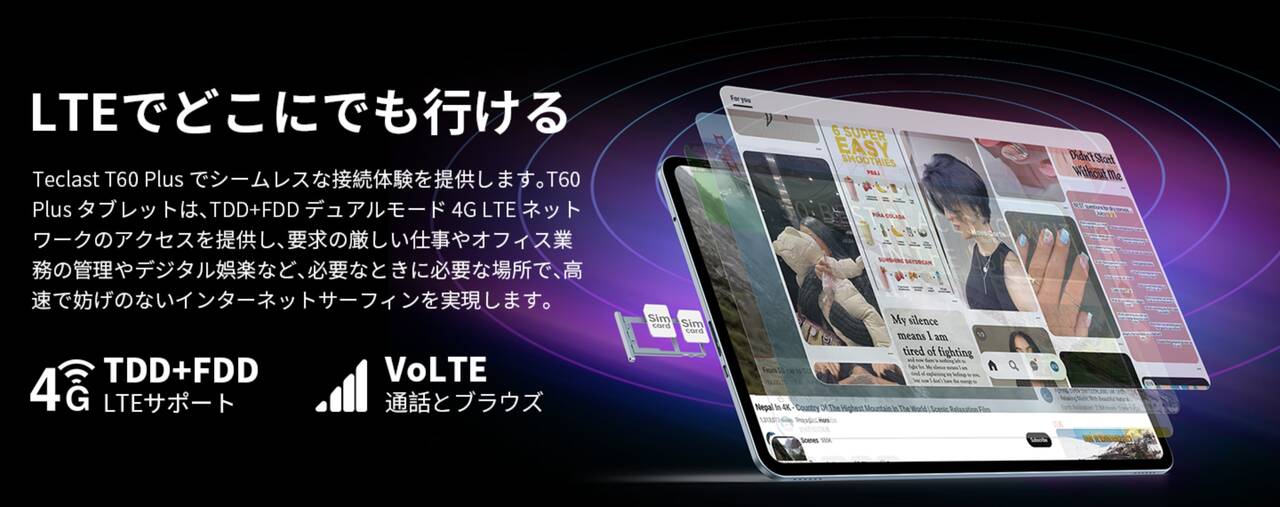 ▼Teclast T60 PlusはSIMカードに対応しているのもGood。対応バンドはスペック表に記載しているんですが、ソフトバンク系回線向きといった感じですね!↓