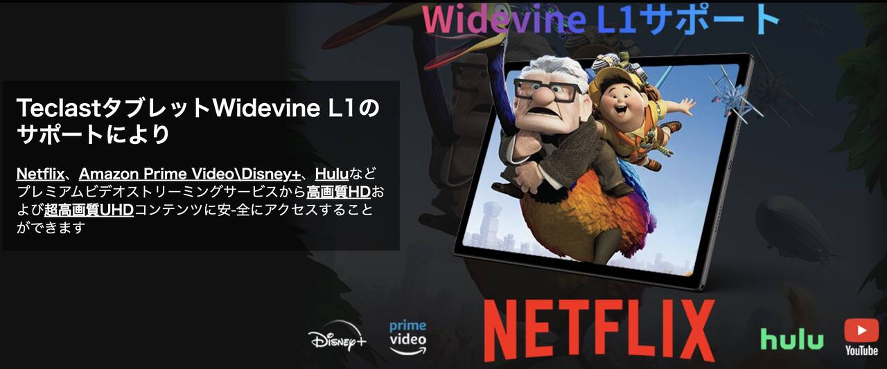 WidevineはNetflixやAmazonプライムビデオなど著作権コンテンツを視聴する時に対応するレベルで映像の美しさが変わるんですが、Teclast T60 PlusはFHDクラスで再生できるL1に対応しているので画面解像度を活かした精細な映像で楽しめますね!