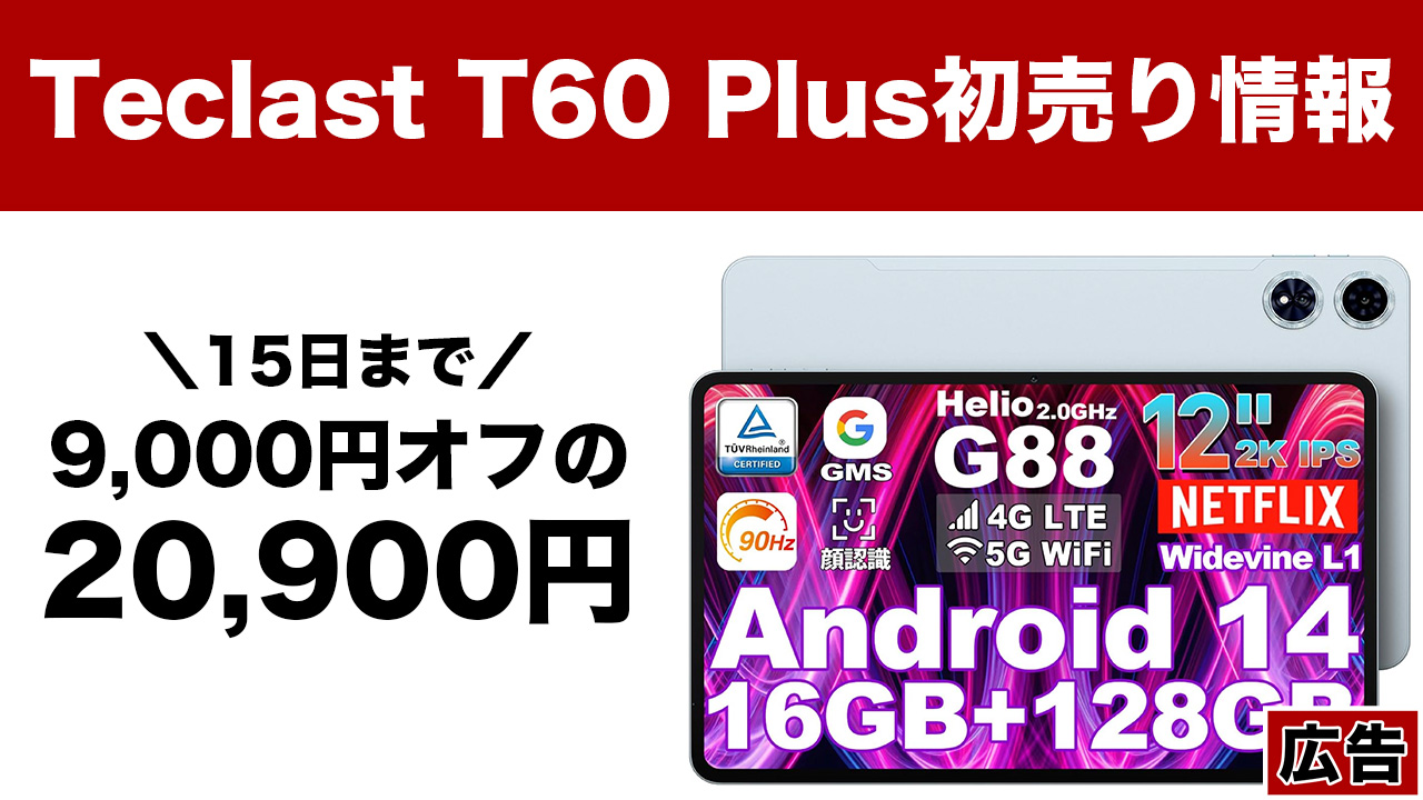 15日まで!12型90Hzタブレット「Teclast T60 Plus」が初売りセールで9,000円オフ!