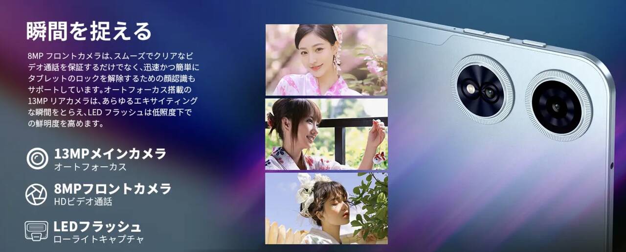 その他、バッテリー容量は8,000mAh、便利な顔認証も対応!OSはAndroid 14でタブレット向けのDockバー表示なども対応しています!