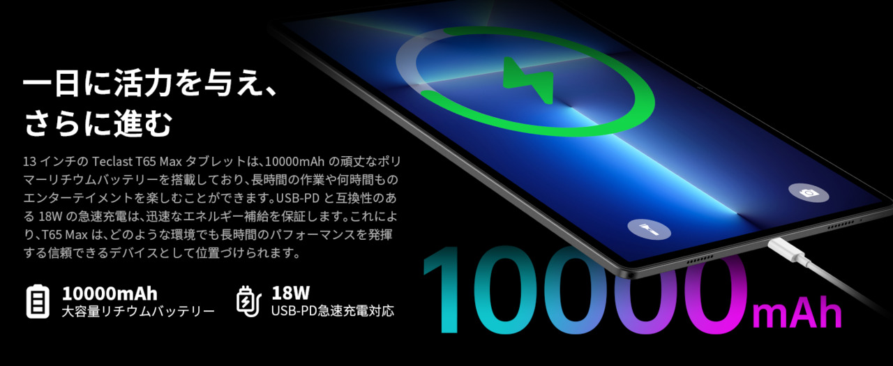 ▼バッテリー容量は10000mAhと大容量!急速充電も最大18Wまで対応しています。大容量もさることながらSoCの電力効率も良さげだし、電池持ちの良さも期待できますね。↓