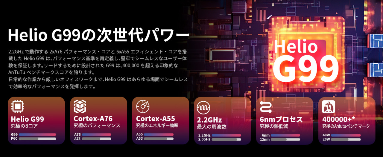 ▼SoCはミドルレンジの中位帯の性能を持つHelio G99を搭載!結構いろんなタブレットに搭載されているSoCなんですが、普段使いは快適に動かせて個人的には結構うれしいチョイス。↓