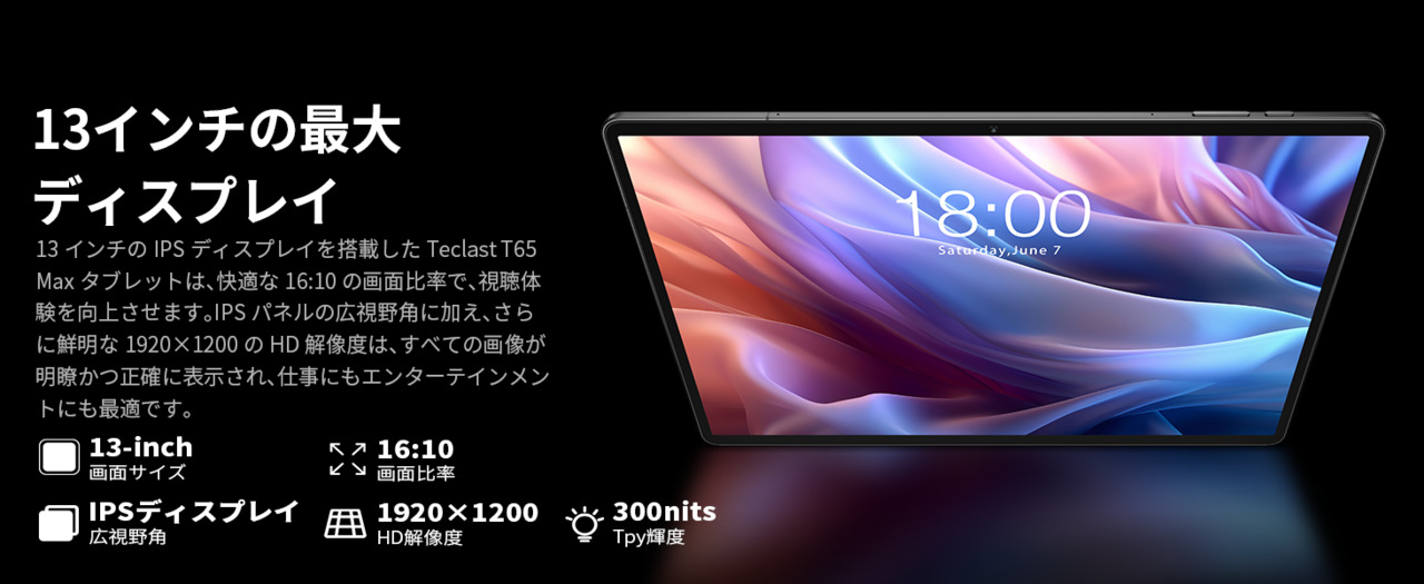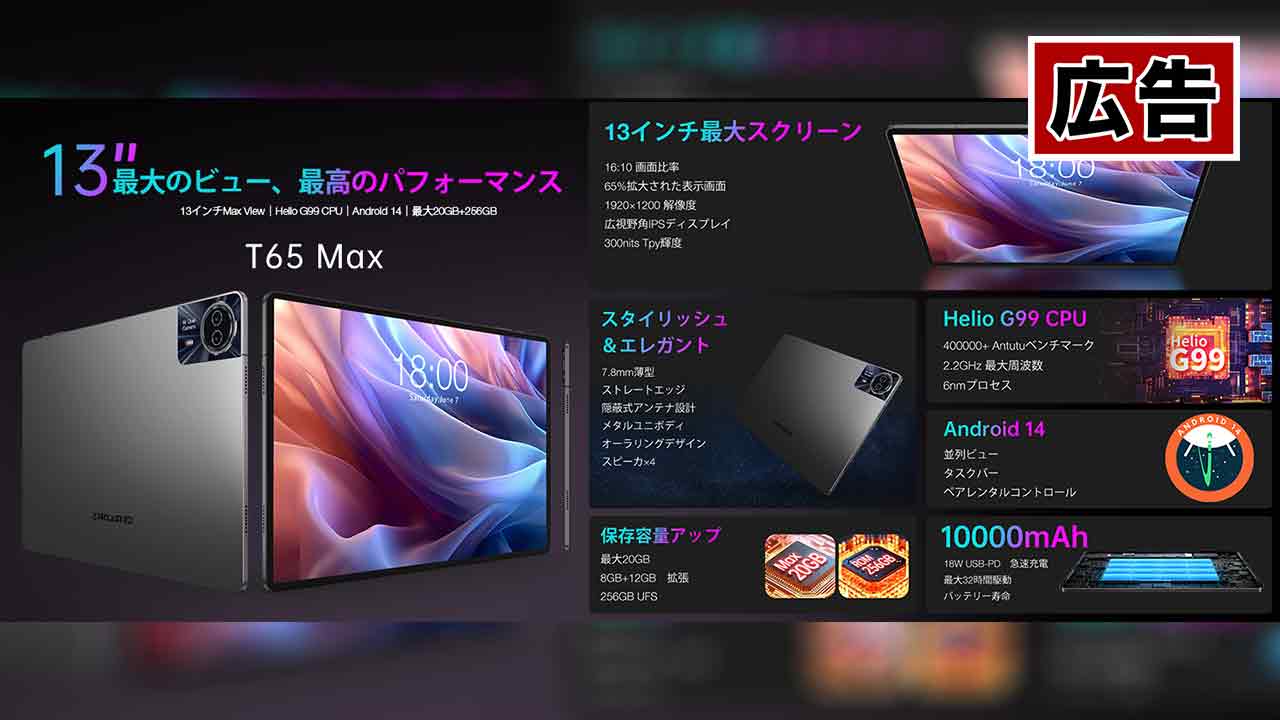 AmazonにてTeclast製タブレット「Teclast T65 Max」がセール中!13インチというタブレットでもかなりのデカサイズが安くなっとります!Helio G99搭載で性能も良さげ、そしてSIM対応のセルラーモデルと結構万能なスペック!