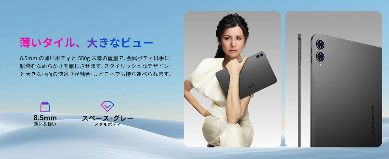 TECLAST T65のカラーはグレーのみの1色とシンプルなタイプ。本体サイズは13インチモデルということもあり大きめですが、重さは約550gとのことでそれなりな軽さ。厚みは8.5mmと標準的。