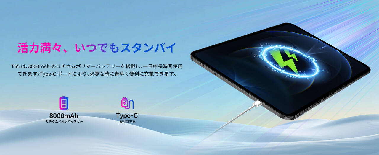 TECLAST T65のバッテリー容量は8,000mAh、タブレットなりの標準サイズ。急速充電についての記載はありません。大画面なので電池持ちはそれほど長くはないものとみていいでしょう。