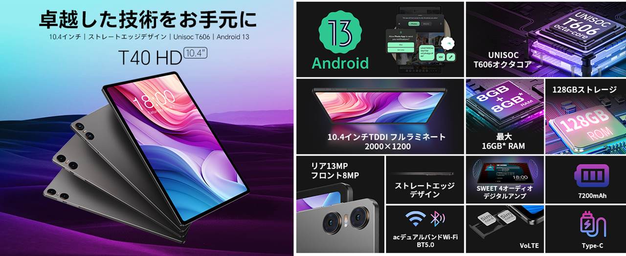 新型モデルT40 HDはSoCにUNISOC T606を搭載したミドルレンジモデル。動画視聴やマンガ本などのメディア視聴用途としては申し分ないスペックとなります。