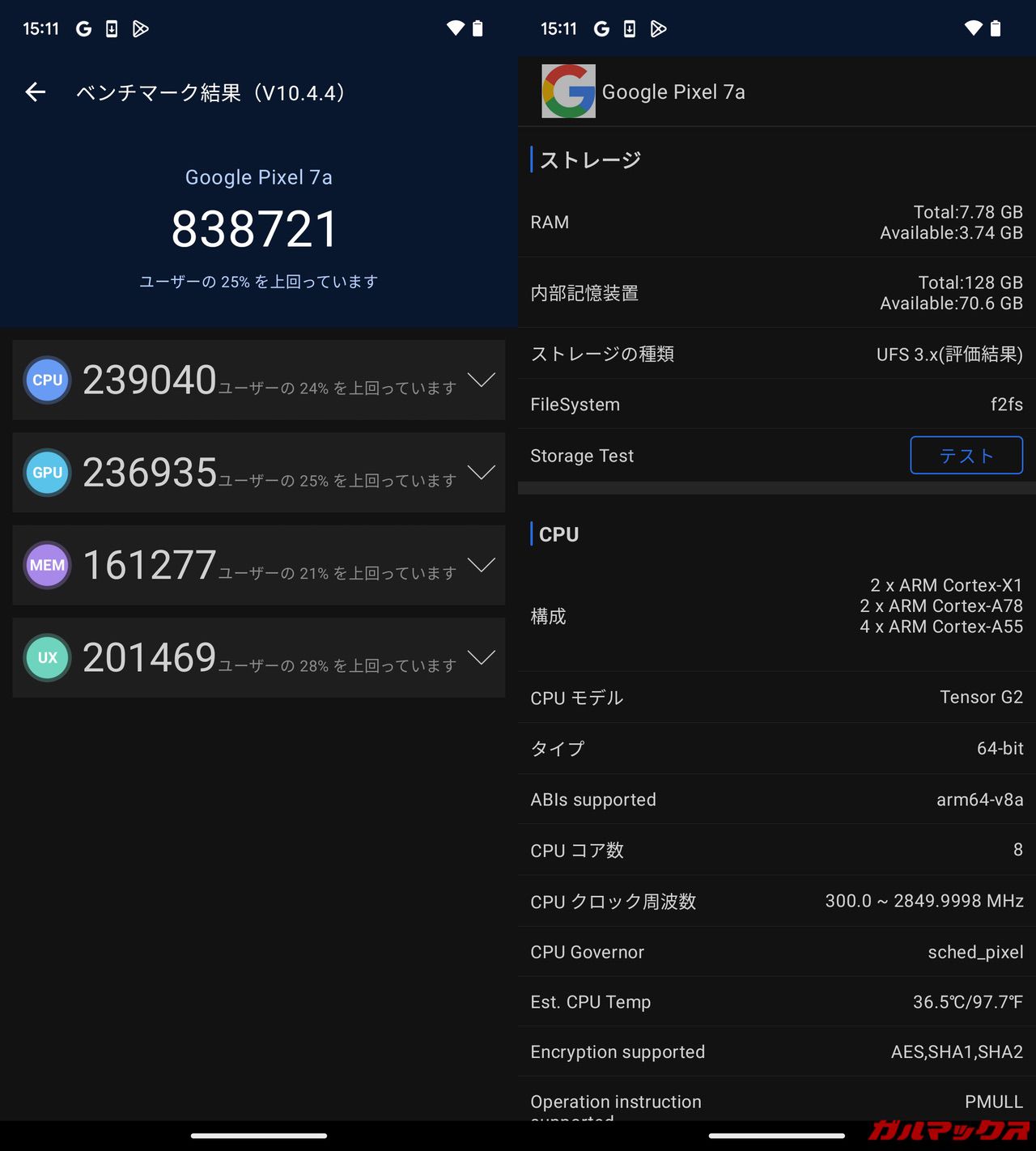 ▼Tensor G2の実機AnTuTuのスコアは総合スコアが838,721点、GPUスコアは236,935点、UXは201,469点となっていました。↓