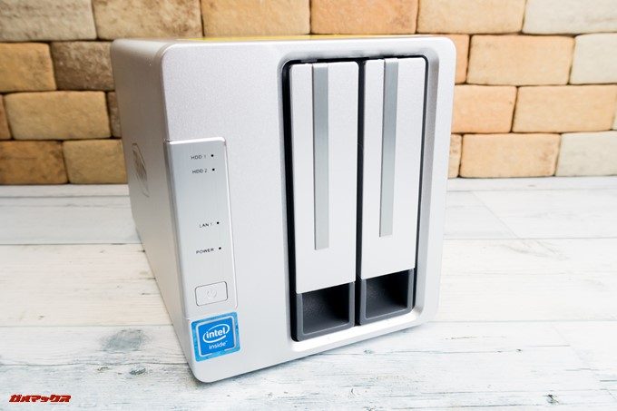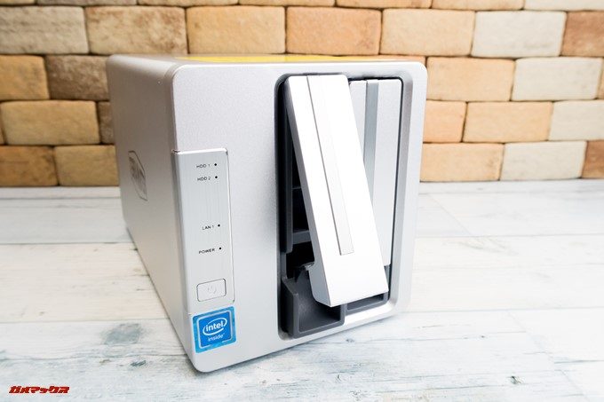 ▼本体の前面には電源ボタンやインジケーター、そして2本の記録媒体が挿入できるスロット。ホットスワップにも対応しているので、ぶっ壊れたHDDはそのままぶっこ抜いて交換できます。便利。↓