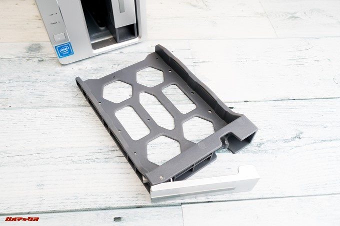 ▼本体前面のHDDスロット下部をバコンと引っ張るとトレイが出てきます。↓