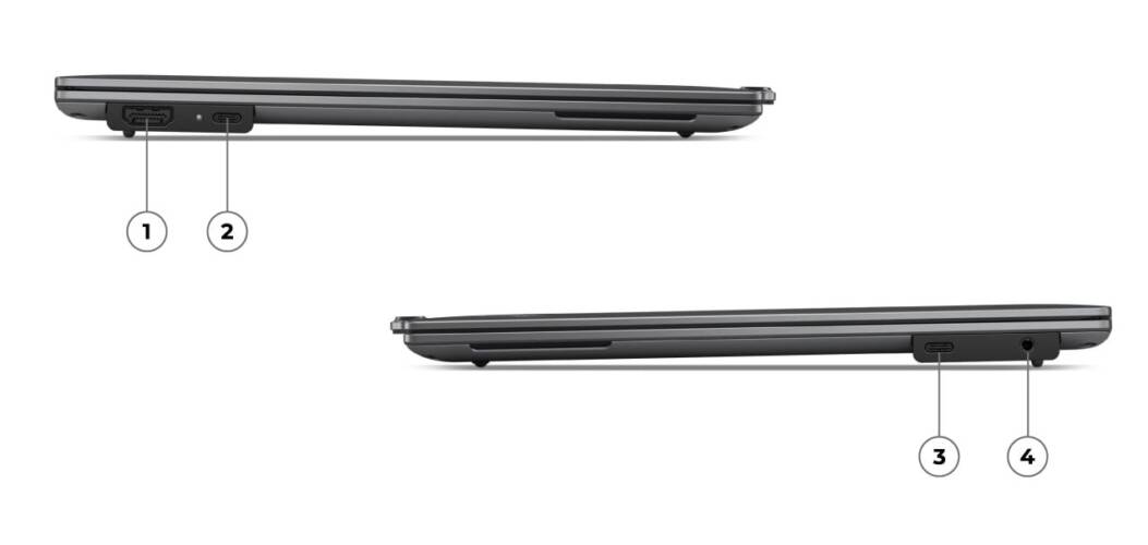 ▼ThinkPad X9 14 Gen 1にはType-C端子が2つ、USB-A端子が1つ、HDMIが1つ、オーディオ端子が1つ。↓