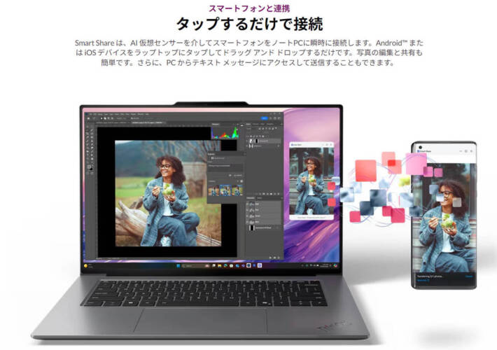 ▼その中で特に気になったのがこのSmartShare。スマホをPCにタッチするだけで連携できるという。ファイルを頻繁に送受信する筆者にとってこの機能はかなりありがたいです。AndroidとiOS(iPhone)のどちらにも対応しているのも高評価。↓