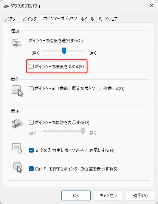 ▼マウスカーソルの加速を切るにはWindowsのマウス設定から「ポインターの精度を高める」というチェックを外すと加速しない設定になります。↓