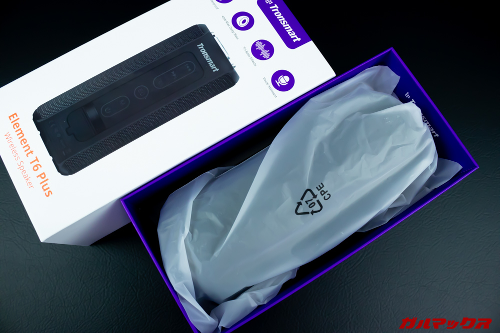 ▼箱を開けるとドンってTronsmart Element T6 Plusが入ってまして、スピーカーのハマってるプラッチック製の台を引っこ抜くと下部にスピーカー以外の付属品が入ってます。↓