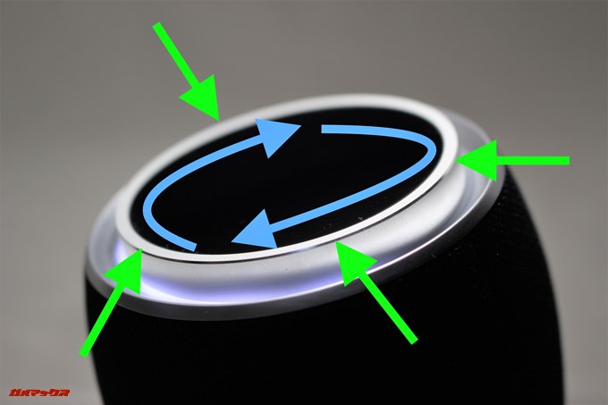 ▼本体上部はLEDが搭載されており、再生中は円形に動きます。白色の綺麗なLEDです。次の項目で動画も出しているので美しいLEDの演出も是非チェックしてみて下さい!↓