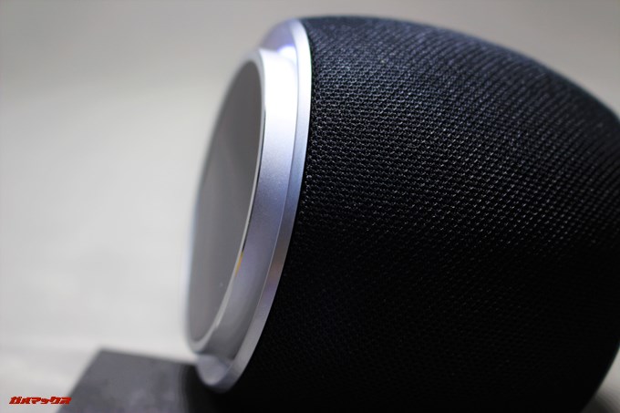 ▼ボリュームの調節は、タッチ部周辺のダイヤモンドカットが施されたアルミ質のリングを回すことで、スマホと連動した音量調節が可能です。また、再生/一時停止は本体上面のタッチパネルに触れるだけで直感的に操作出来ます。↓