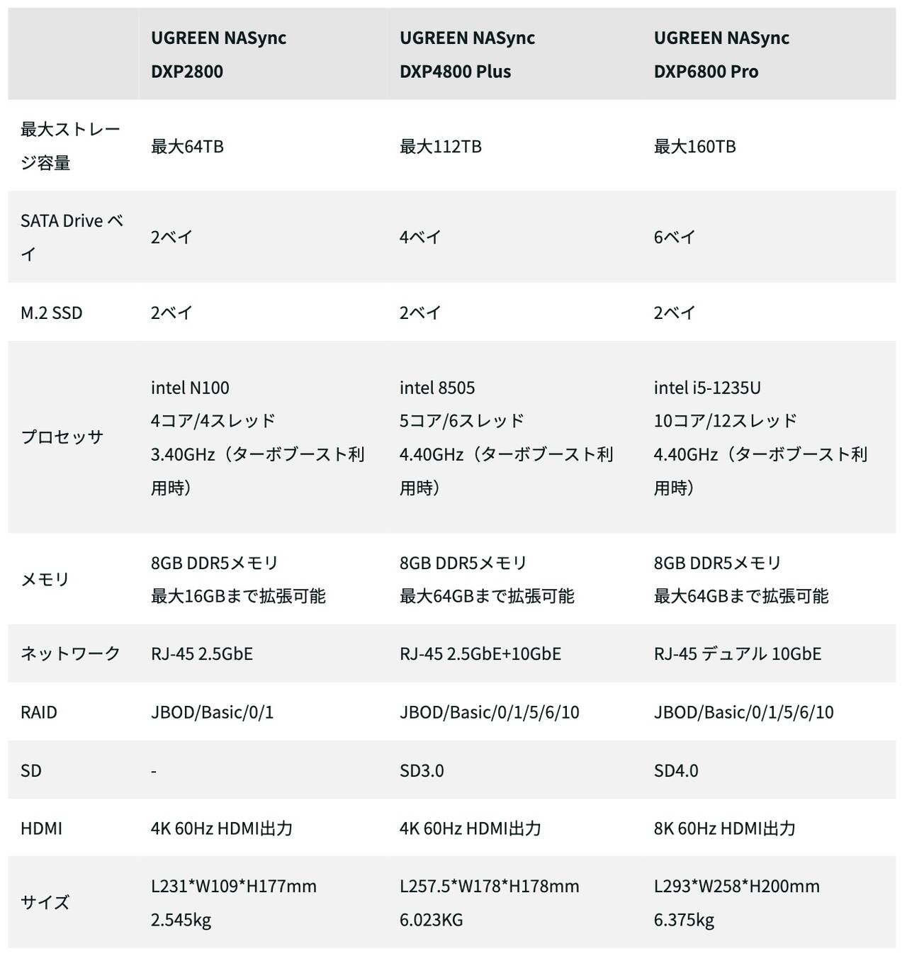 「DXP2800」「DXP4800 Plus」「DXP6800 Pro」のスペック