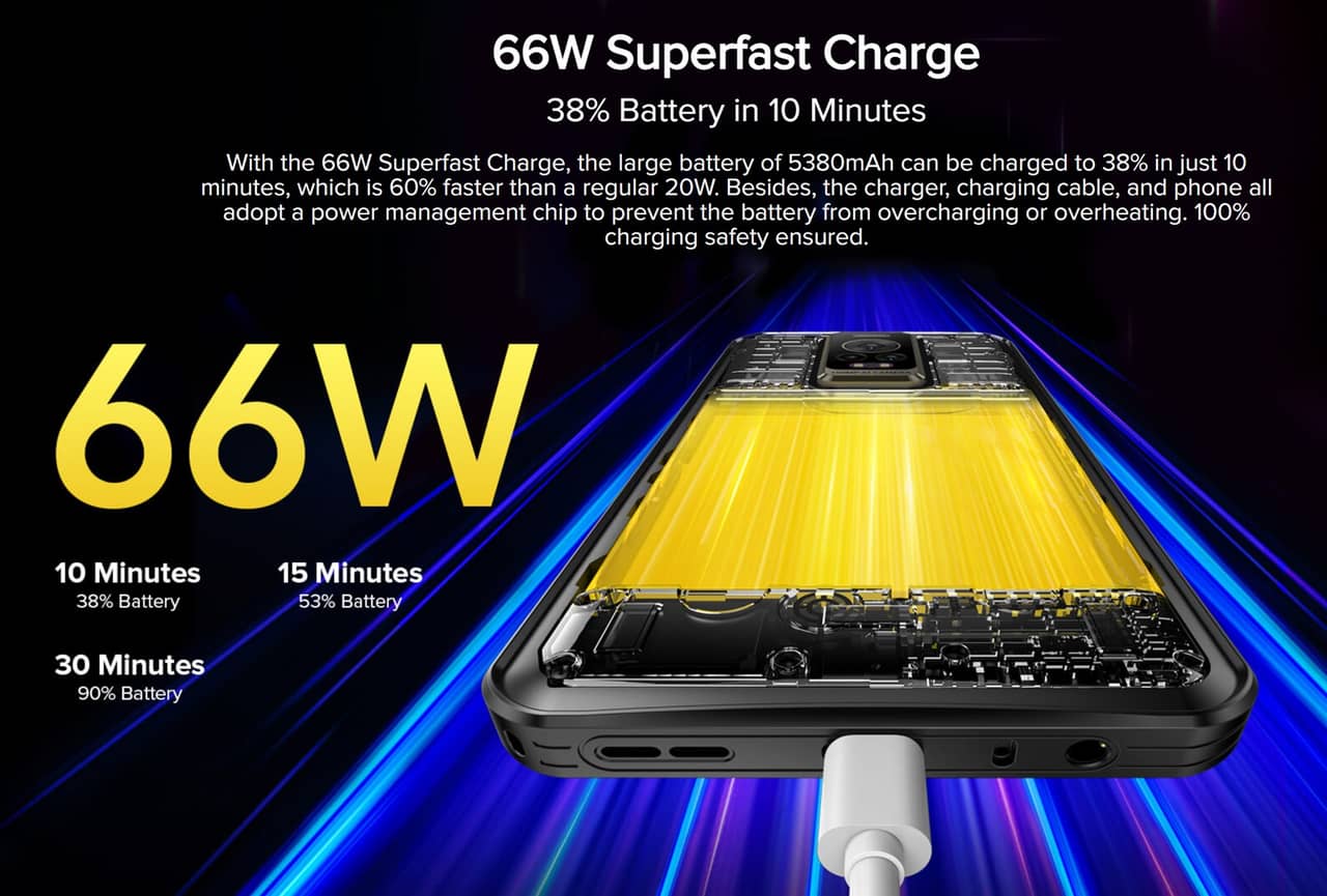 ▼バッテリー容量は5,380mAhで急速充電は66Wとかなりの速さ!15分程度の充電で53%も充電できるってメッチャ速い!↓