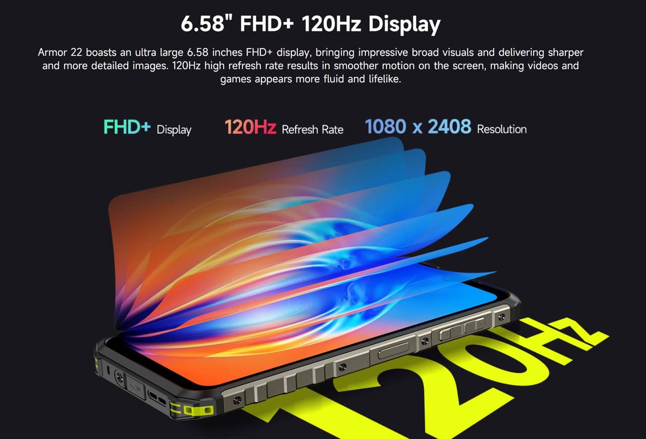 Ulefone Armor 22の画面はサイズが6.58インチ、解像度は2,408×1,080、ディスプレイは液晶を採用しています。画面形状はノッチ(水滴)となります。
