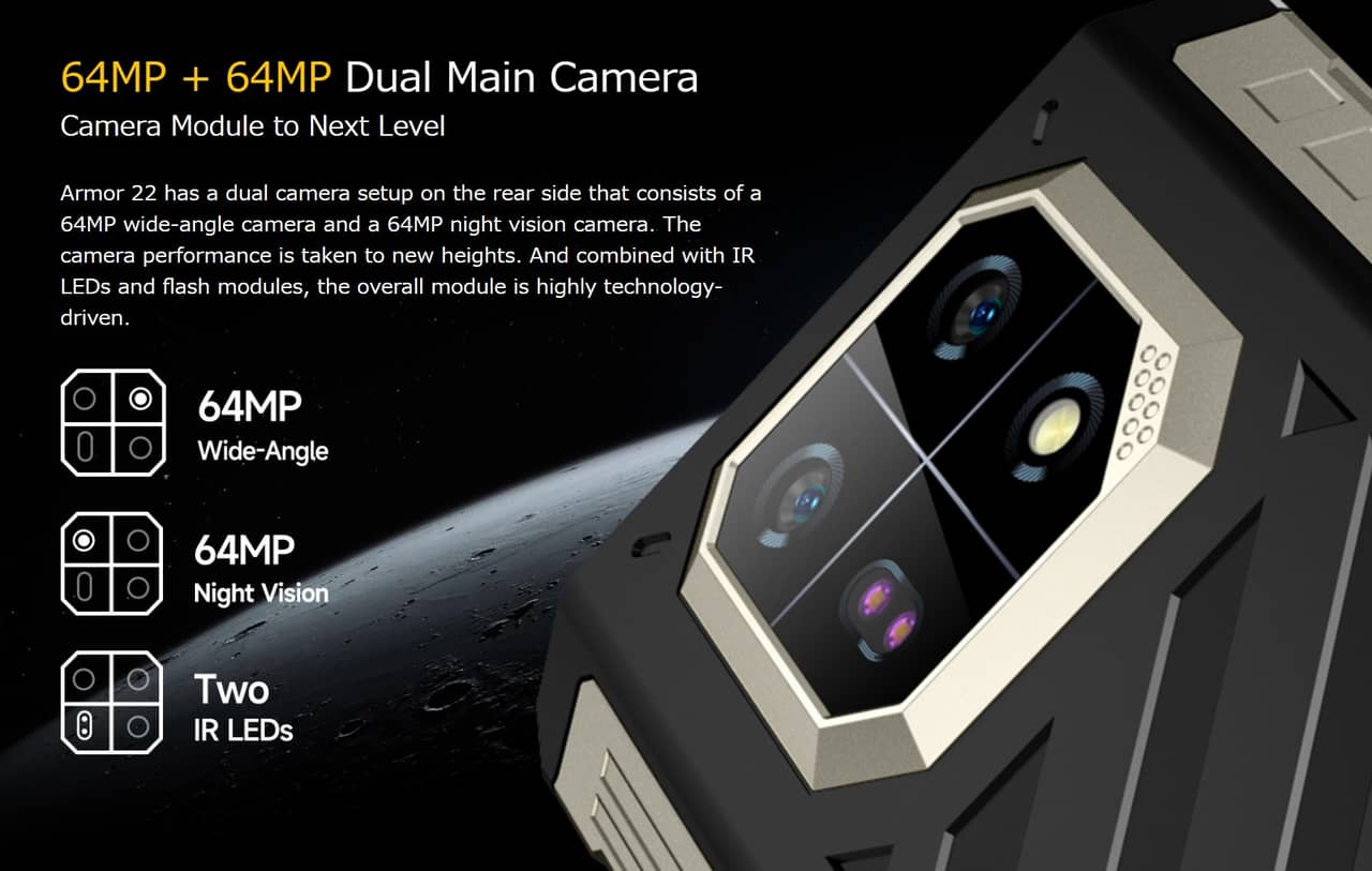 Ulefone Armor 22の背面カメラは広角のメインカメラ(6,400万画素)、ナイトビジョンカメラ(6,400万画素)の2眼構成です。