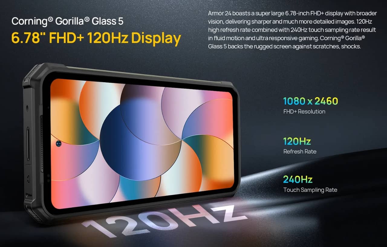 Ulefone Armor 24の画面はサイズが6.78インチ、解像度は2,460×1,080、ディスプレイは液晶を採用しています。画面形状はパンチホール(中央)となります。