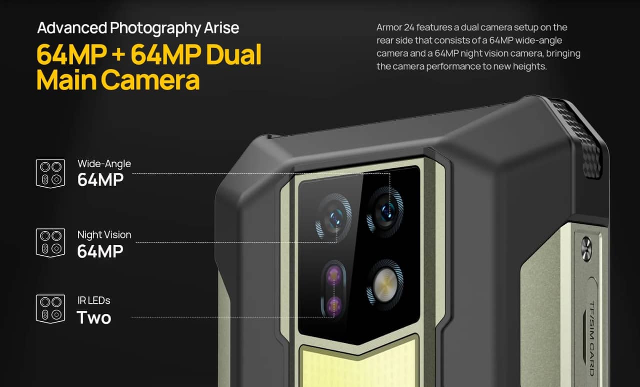 Ulefone Armor 24の背面カメラは広角のメインカメラ(6,400万画素)、ナイトビジョンカメラ(6,400万画素)の2眼構成です。