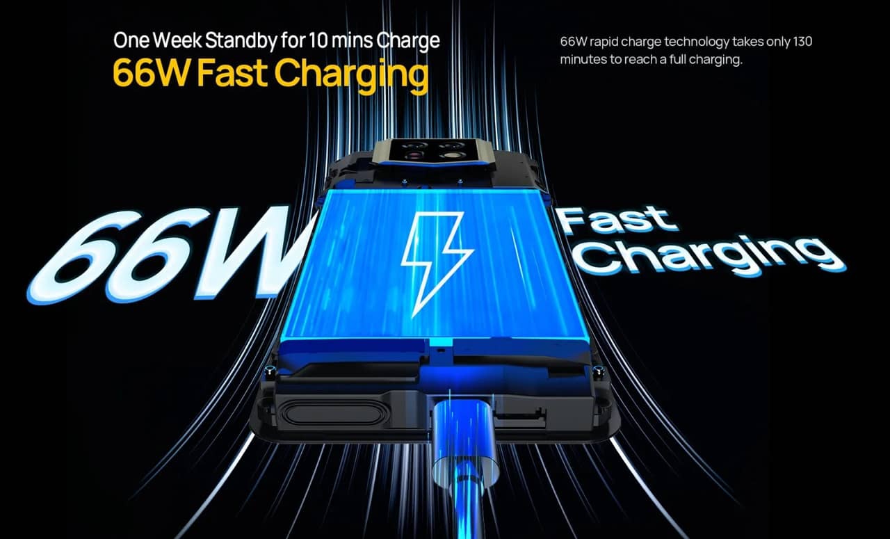 ▼巨大バッテリーだと相対的に充電が遅くなってしまうのですが、Ulefone Armor 24はその弱点を補うべく66W充電に対応となっており隙がないスペック!0%→フル充電には2時間10分はかかるものの、数日使える電池持ちを考えれば十分でしょう。↓