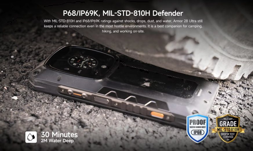 Ulefone Armor 28 Ultra 5Gはタフネススマホだけあってすげー頑丈です。完全防水IP68、お湯耐性を持つIP69K、そして耐衝撃等級を示すMIL-STD-810Hのいずれにも完全対応!これによりケースなんてなくても運用できるのも魅力だったり。