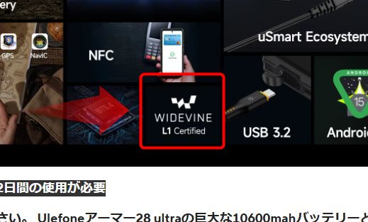 ▼あとちっさく書かれてて最初気づきませんでしたが、Widevine L1も押さえてます。スゲえ。これがあるとプライムビデオとか著作権コンテンツでアニメとかドラマとか映画をHD画質で見られるんでコンテンツ試聴機にもなれますね。↓