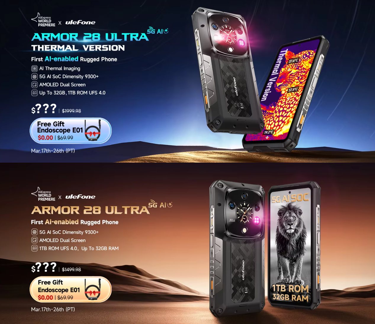 Ulefone Armor 28 Ultra 5Gの発売日は3月17日を予定!価格はAliExpressで1,499.98ドルと表示されていますが、多分いつもの見せ価格でしょう。さすがにこのまま発売することはないはず。