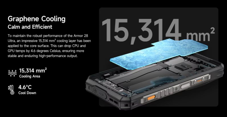 ▼15,314mm2のくそデカ冷却パネルも完備。タフネススマホは分厚いため熱がこもりやすい、そんな弱点も克服にかかっています。ベンチマークとか原神とかやったときの熱はどれほどなのかもためしたいところ!↓